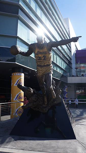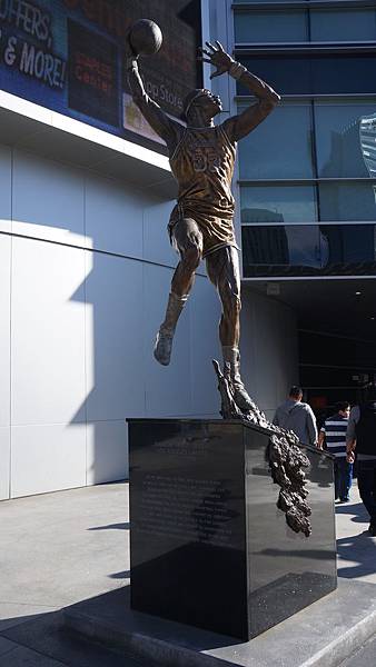 只要洛杉磯不塞車,其實絕大部分的區域多少都有高速公路經過,開車還是很快的,所以雖然有不小心開錯路,不過我們還是在比賽開打前快三個小時就抵達Staples Center了,球場都還沒開門咧,就在球場附近四處走走。球場外有立著Magic Johnson和Kareem Abdul-Jabbar的銅像,想當年好像是國小的時候有一次魔術說要來台灣打表演賽,後來不知道為什麼變成是Jabbar來台,那一次我還有跑去看現場,結果現在我直接跑來他們的主場踢館了,想想這感覺還真奇妙。