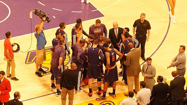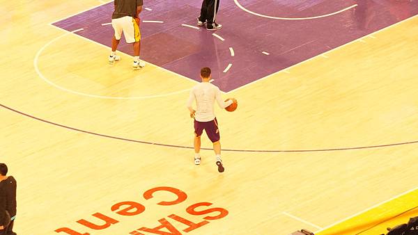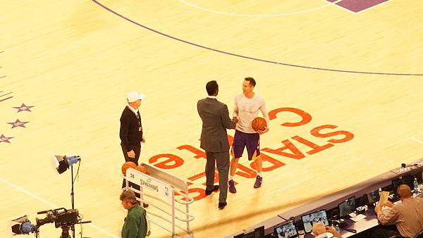 在決定去美國之前,原本以為Nash今年已經整季報銷了,這次能看到他穿西裝就不錯了,沒想到在我們出發前一週Nash突然復出打了一場比賽,整個讓我燃起希望,就像撿到一千塊的感覺,但是那場之後Nash卻又休息了幾天,現在在熱身的意思是....難道他今天會上場嗎?好耶!馬上在Line群組裡告訴大家Nash正在熱身的消息,結果得到的回應是「不要發空白Line好不好?」、「可以把他封鎖到比賽結束嗎?」....