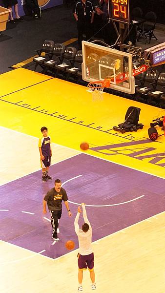 買完衣服,我們進入觀眾席尋找我們的座位,第三層還真他媽的高啊!比想像中的遠,場內已經陸陸續續有一些湖人的球員在熱身,太陽的球員可能是離比賽開打還有一段時間,也許在其他地方熱身,至少現在是一個都沒看到;根據多年看球的經驗,我馬上就憑投籃姿勢和一些細微的動作在眾多湖人球員裡認出一個不怎麼高也不怎麼壯,但是無比熟悉的身影,我想你們應該也知道我是在講誰,是Steve Nash耶!