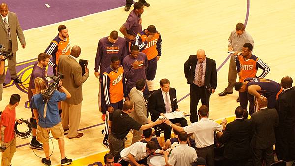 不過好景不是很長,大家應該還記得我拉肚子還沒完全好吧,為了怕比賽開打後還在跑廁所,開賽前有很長一段時間我都待在廁所裡面,用行動表示我對湖人這支球隊的支持,幫他們製造了相當數量的肥料;等我回到場內,比賽也快開打了....咦?Nash人呢?我以為D'Antoni應該有聽到我的心聲才對啊,為什麼Nash沒有換球衣?結果事實證明Nash熱身只是熱好玩的,撿到的一千塊掉了....