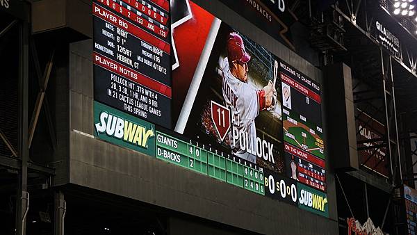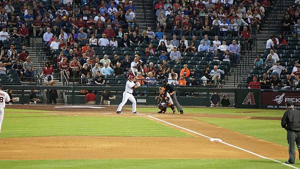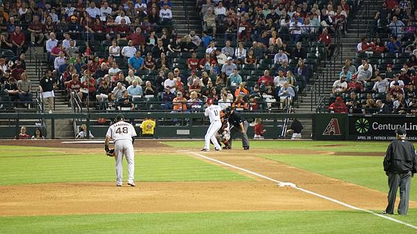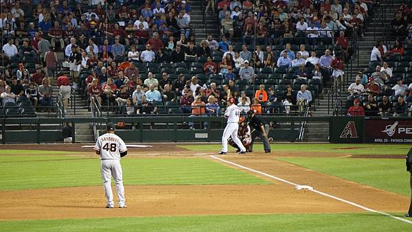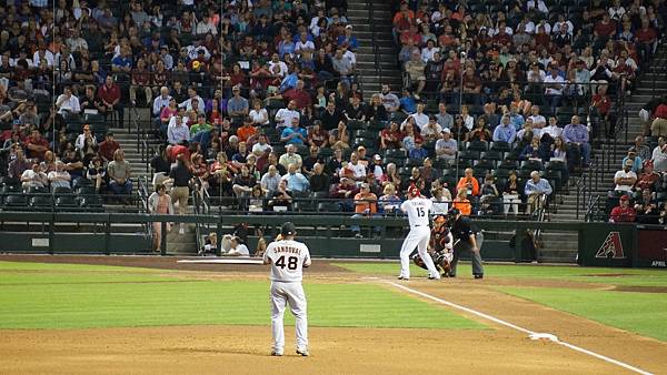 另外,在開賽前亮手套向我示威的那對老夫妻在比賽過程中跟我有不少互動,也看得出來他們是真的很投入在比賽中,幾乎每個響尾蛇球員上場他們都很賣力的加油;在一次Aaron Hill上場打擊時,老先生半開玩笑的跟我說「不好意思,這球我要先接走了。」,我馬上大方回答『沒問題,你接Aaron Hill的全壘打,我要接Goldschmidt的。』他們也馬上報以大笑,不過結論是....我們兩個都沒接到球。 XD