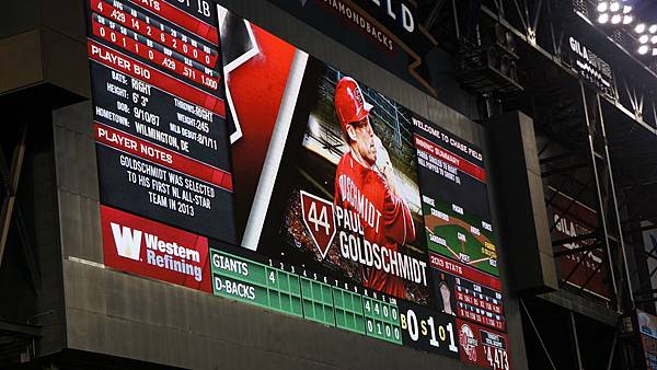 還記得前一個晚上,當Mike Trout上場打擊時猴子球迷的鼓譟是多麼的超過,照理說Goldschmidt在小蛇的地位應該跟Trout在猴子差不多才對,原本還在期待響尾蛇球迷會用怎樣的歡呼聲迎接他們的新生代主砲,結果....好像沒有預期中的大聲啊,待遇怎麼差這麼多?Goldschmidt去年不是國聯MVP第二名嗎?