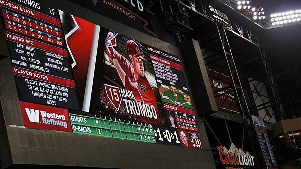 既然觀眾掌聲不夠熱烈,那就用手中的棒子逼他們必須為你歡呼吧!Matt Cain的狀況也沒有好到哪去,一上來就被Parra安打上壘,一出局後Goldschmidt一棒就把球掃到右外野....喂!我坐在左外野啊,你打錯邊啦!可惜只差一點點沒有出牆,在警戒區落地形成二壘安打送回Parra先得一分,接著自己再靠著Prado的安打回來得分,那你剛剛為什麼不直接全壘打就好呢(喂)?眼看是個吃大橘子的好機會,一出局兩在壘,Trumbo來發三分砲吧!來一發....幹,雙殺打,你知道你FB的老闆在看台上臉都綠了嗎?