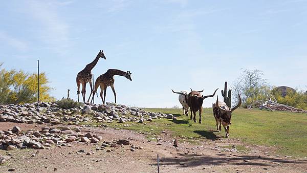 由於氣候的關係,鳳凰城動物園基本上是以熱帶沙漠的動物為主,一走進園區就看到一片遼闊草原,幾隻長頸鹿和類似羊駝的動物雜居其間,看來悠然自得;美國地方大果然還是有差,台灣畢竟腹地有限,也沒辦法像鳳凰城動物園基本上只有一種氣候的動物,所以沒辦法像鳳凰城一樣每隻動物都分到這麼大的空間,感覺動物住在這裡比較自由,管理上人性化許多。