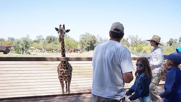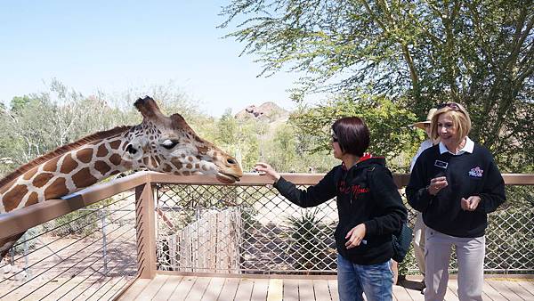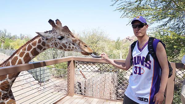 第一次在這麼近距離和長頸鹿接觸,沒想到長頸鹿的舌頭看起來跟木頭一樣,飼料倒是老實不客氣的一捲就走,把剩下的飼料都給老婆,老婆玩得開心就好;至於鳳凰城動物園的另一個賣點騎駱駝我們就沒有去嘗試了,騎過馬以後就覺得騎駱駝沒有特別吸引人,加上駱駝的體味實在太重了....所以興趣不高。
