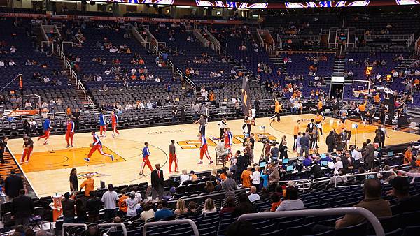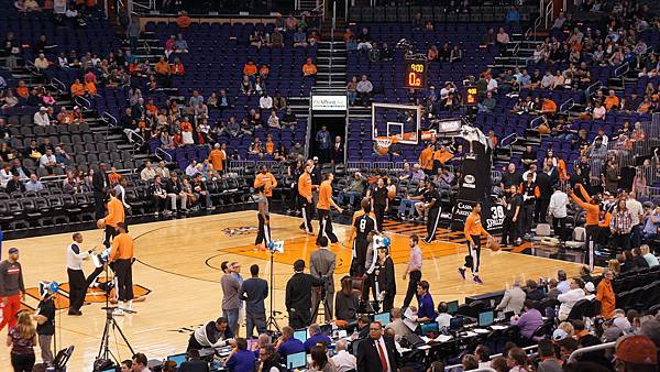 球場內已經有部分太陽和快艇的球員們在熱身,本季快艇的陣容很完整,以往常常被大家戲稱為洛杉磯二軍,但最近幾年狀況似乎完全顛倒過來了;我們這次剛好是看到太陽對洛杉磯雙雄的比賽,我原本預期應該是贏湖人輸快艇的,結果上一場對湖人讓我看到一場打得跟垃圾一樣的比賽,老實說今晚我對贏球沒什麼特別期待,只希望就算打不贏好歹也輸得好看一點這樣。