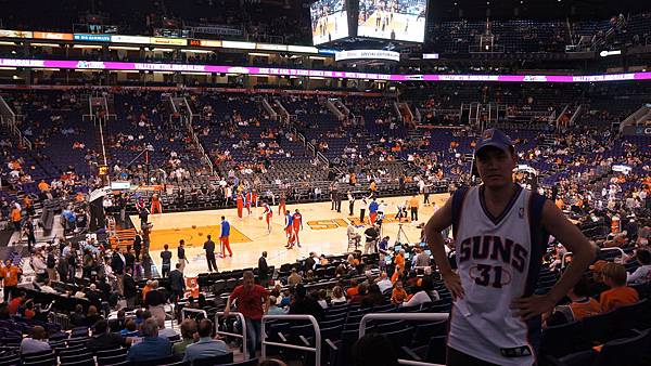上一場比賽在客場,面對洛杉磯滿場的湖人球迷根本什麼都不能做,打那麼爛老實說做什麼也都蠻丟臉的;不過今天是在鳳凰城,今天晚上在這個球場內都是自己人,這輩子可能也就來這麼一次了,那還在等什麼呢?所以我把照相機交給老婆,並明確表示『我今天就是來當瘋子的』,所以不負責拍照。